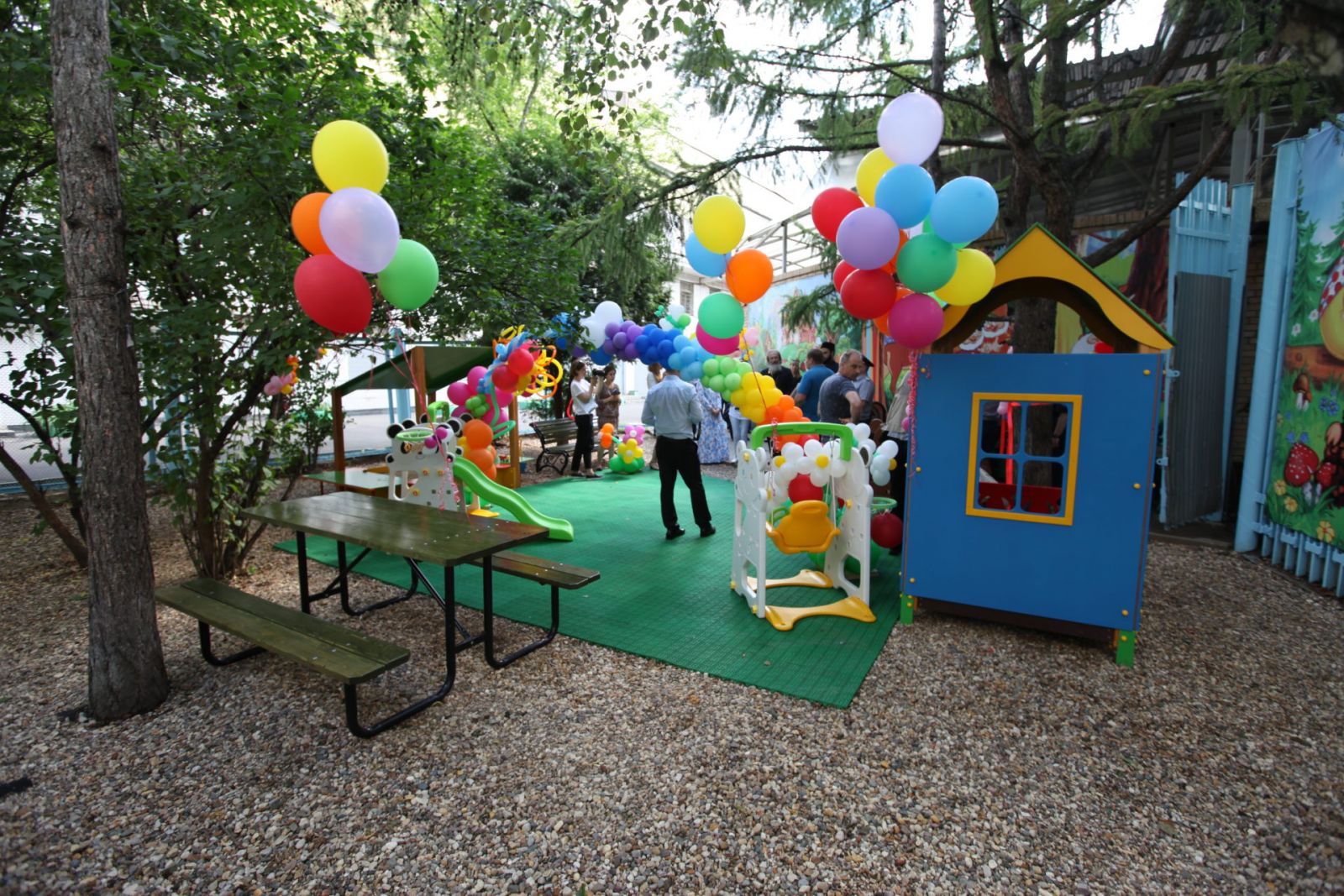 После реконструкции земля на детской площадке покрыта гравием и застелена резиновыми панелями, пропускающими воду, появилось больше снарядов для детского развлечения и песочница теперь закрывается от непогоды и от кошек.