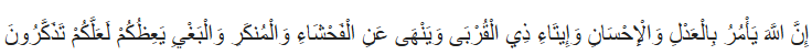“Воистину, Аллах повелевает блюсти справедливость, делать добро и одаривать родственников. Он запрещает мерзости, предосудительные деяния и бесчинства. Он увещевает вас, — быть может, вы помяните назидание” (16:90).