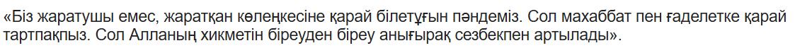 «Воистину Мы создали вас из мужчины и женщины и сделали вас народами и племенами, чтобы вы узнавали друг друга, и самый почитаемый перед Аллахом среди вас — наиболее богобоязненный» (49:13). Тем самым Благородный Коран заявляет, что разные религиозные общины должны находиться между собой в балансе и что Всевышний сам сохраняет этот Божественный порядок. Абай Кунанбаев – прославленный в веках сын казахской земли, глубоко постигший суть коранического гуманизма, написал созвучные кораническим аятам строки:
