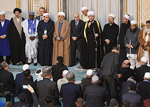 Участники XVIII Международного мусульманского форума на пятничном намазе в Московской Соборной мечети