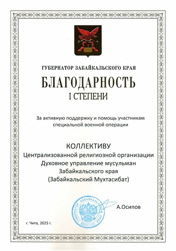 Духовное управление мусульман Забайкальского края удостоено Благодарности I степени Губернатора Забайкальского края